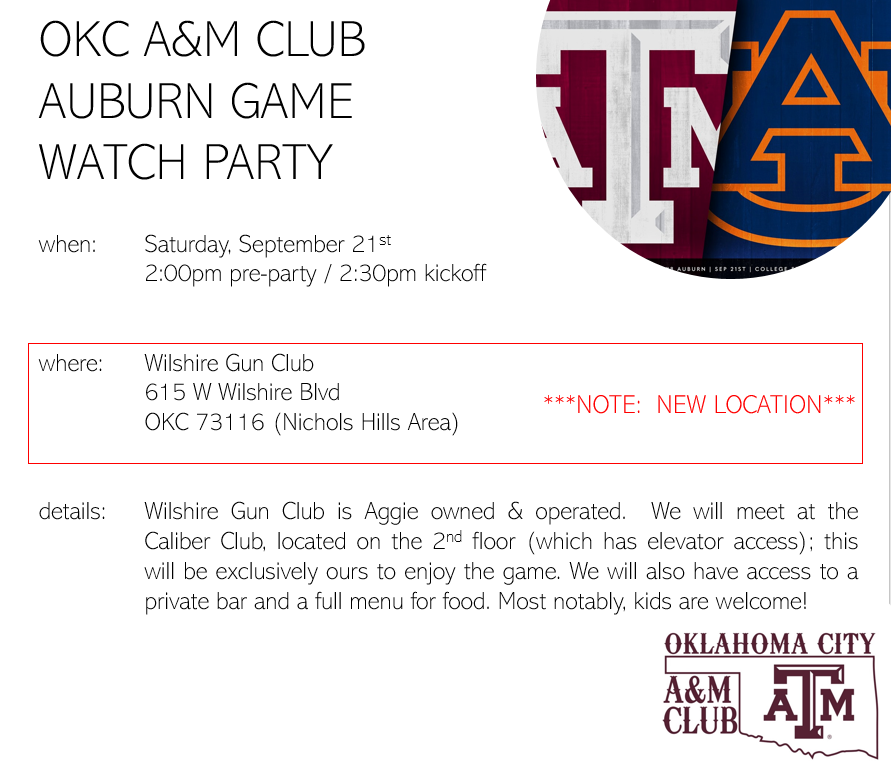 Howdy! Our next event of the season will be on September 21st to watch our Fightin’ Texas Aggies BTHO the #8 ranked Auburn Tigers. The watch party will be at a new venue, the Wilshire Gun Club (Nichols Hills area), which is Aggie owned and operated. We will meet at the Caliber Club located on the 2nd floor, which has elevator access. This space will be exclusively ours to enjoy the game. We will also have access to a private bar and a full menu for food.